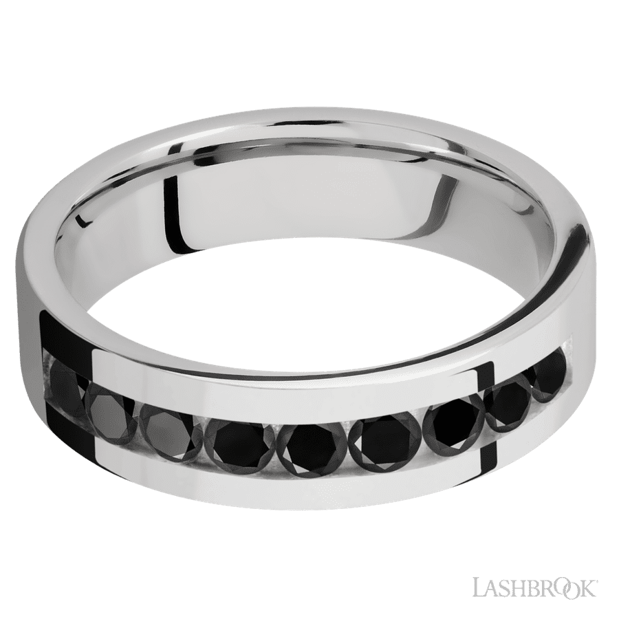 6 mm wide/Flat/Cobalt Chrome band with an arrangement of 9, .1 carat Round Black Diamond stones in a Channel setting.