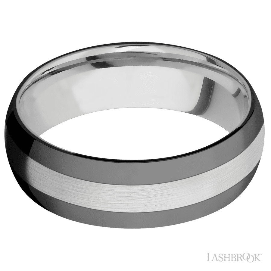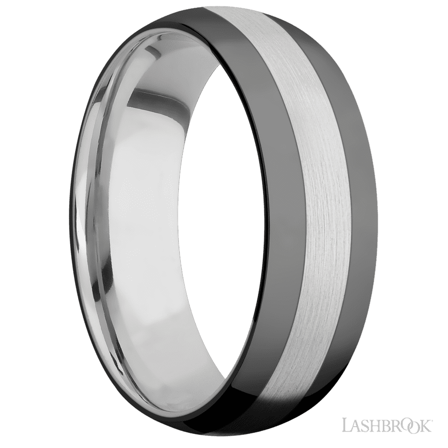 7 mm wide/Domed/Cobalt Chrome band with two 2 mm Double Off Center Edge inlays of Zirconium.
