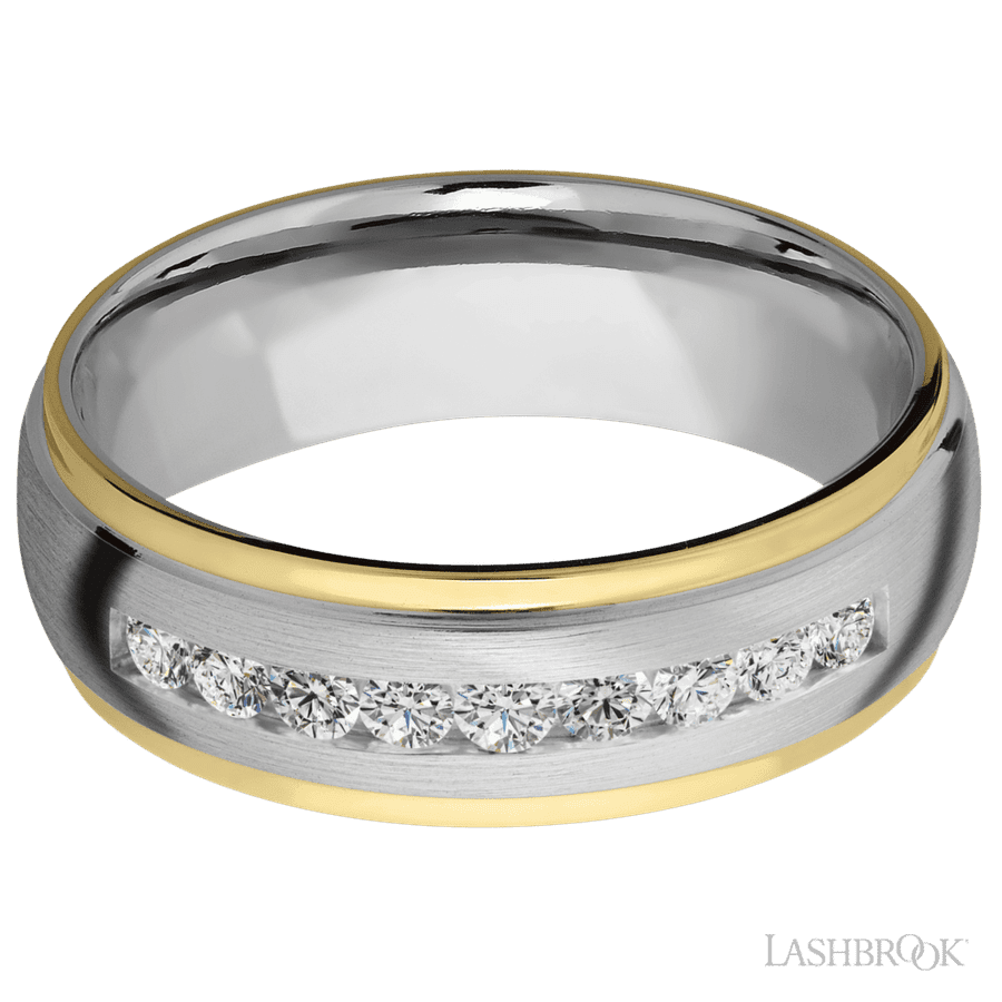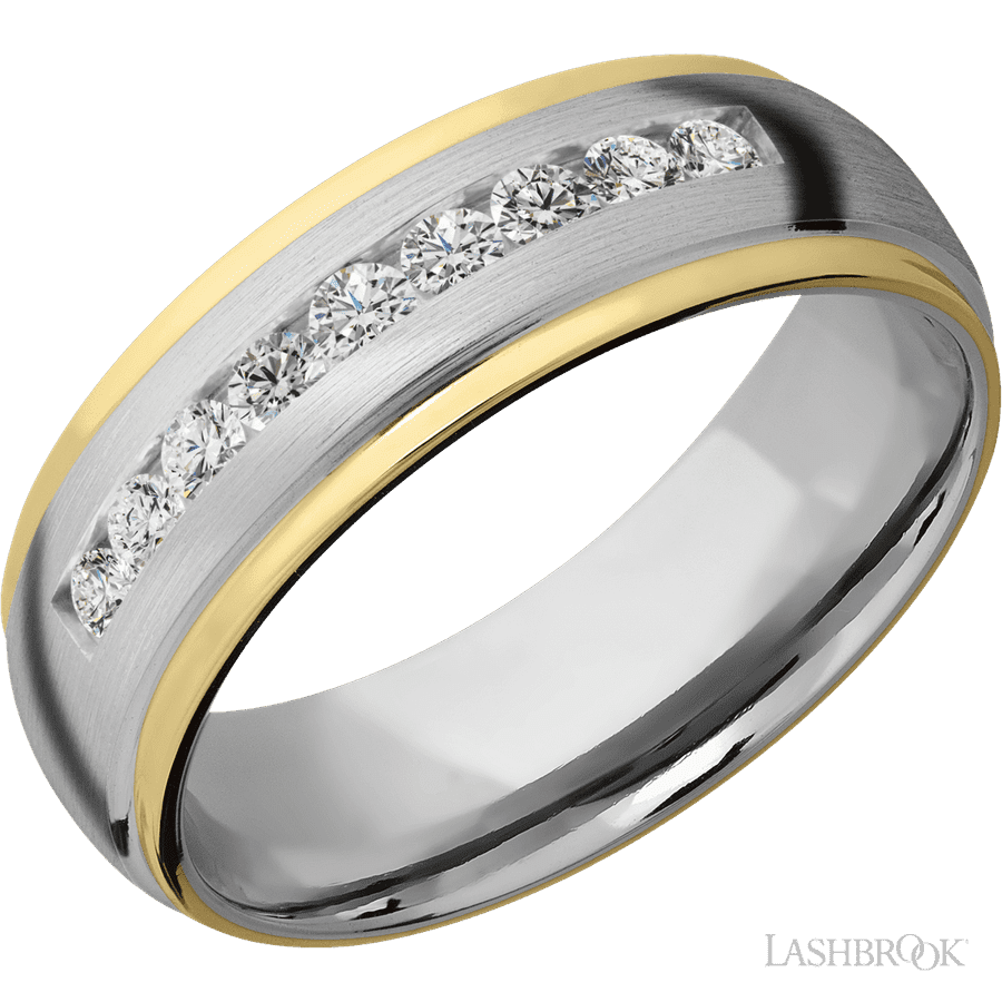 7 mm wide/Domed Stepped Down Edges/Cobalt Chrome band with two 1 mm Edge inlays of 14K Yellow Gold and featuring an arrangement of 9, .05 carat Round Diamond stones in a Channel setting