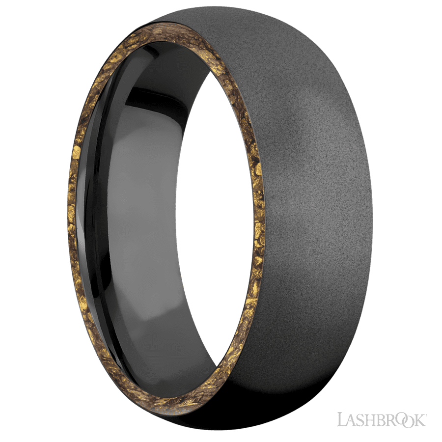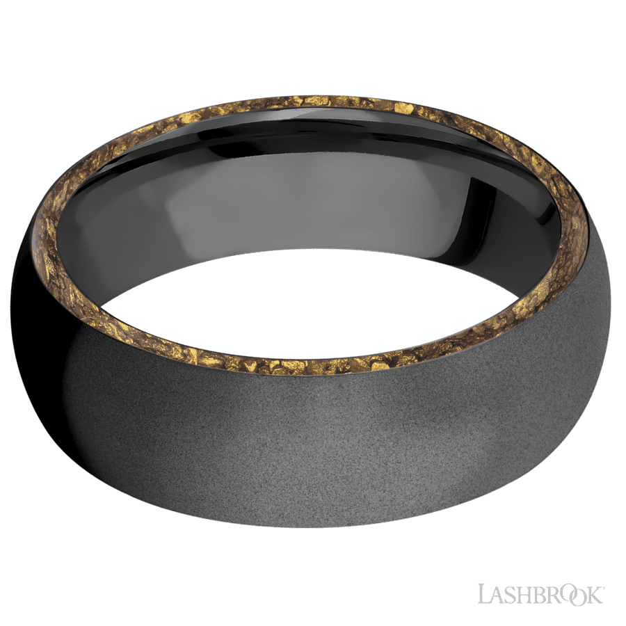 7 mm wide/Domed/Zirconium band with two 1 mm Side inlays of Alaskan Gold Nugget.