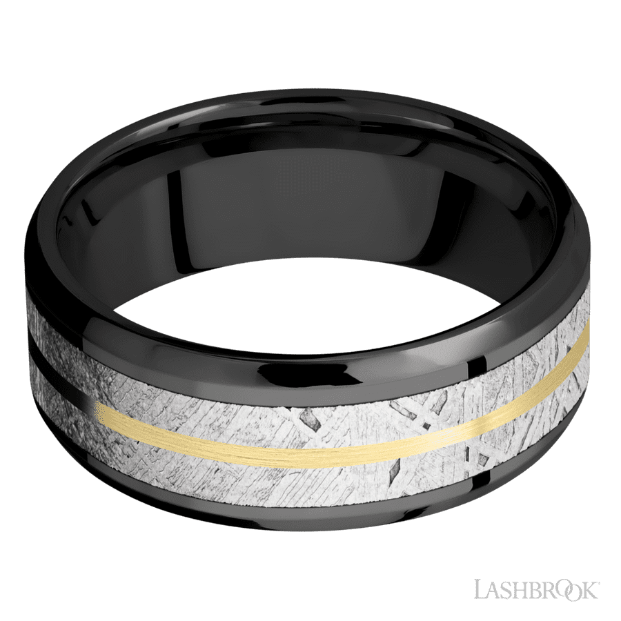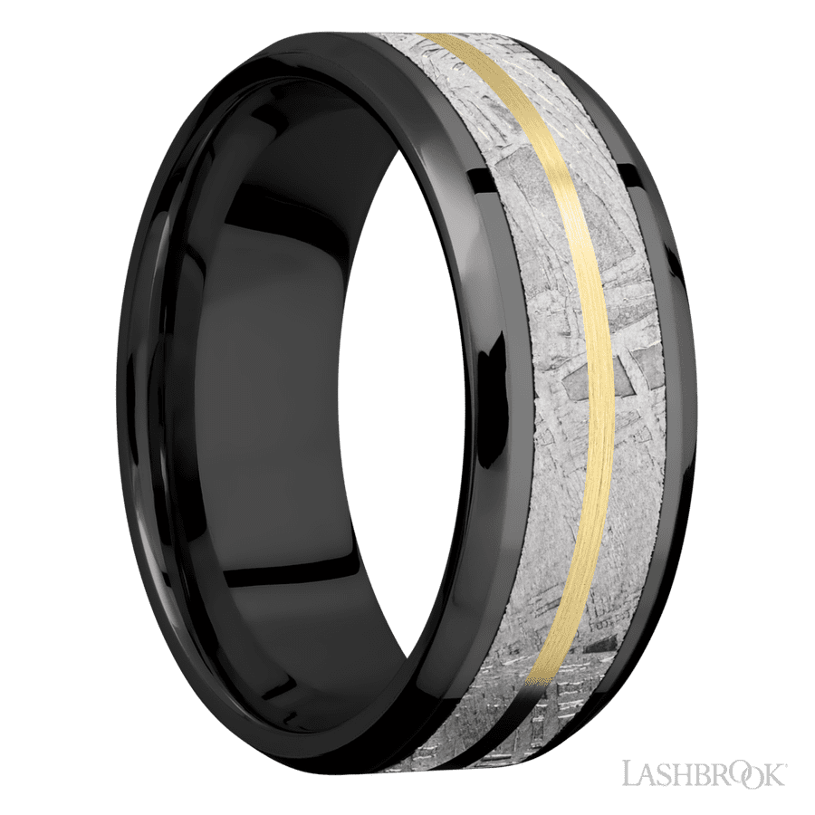 8 mm wide/Beveled/Zirconium band featuring inlays of Meteorite and 14K Yellow Gold.