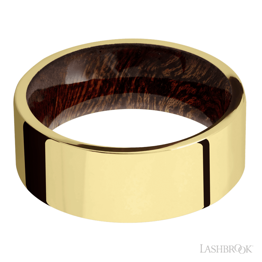 8 mm wide Flat 14K Yellow Gold band featuring a Sapele sleeve.