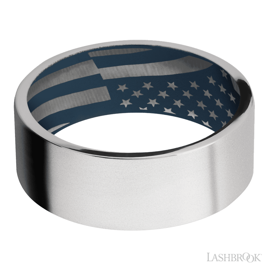 8 mm wide Flat Cobalt Chrome band featuring a Navy Blue sleeve.