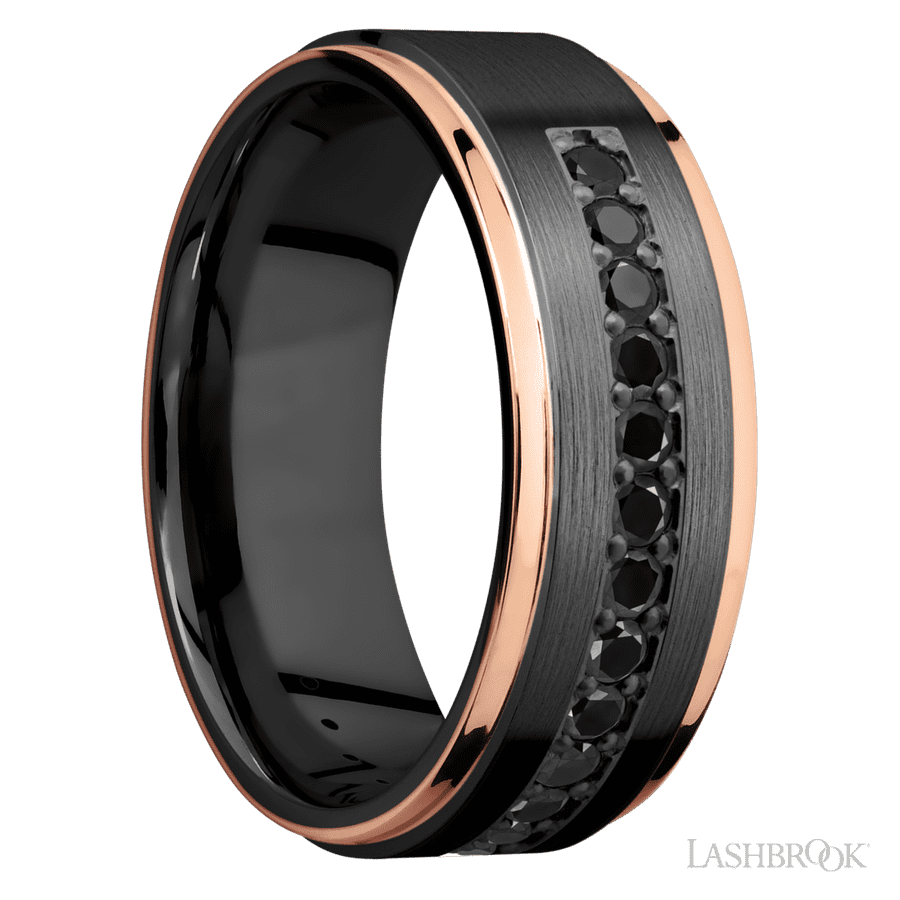 8 mm wide/Flat Grooved Edges/Zirconium band with a Half Eternity arrangement of .03 carat Round Black Diamond stones in a Bead setting and featuring two 1 mm Edge inlays of 14K Rose Gold