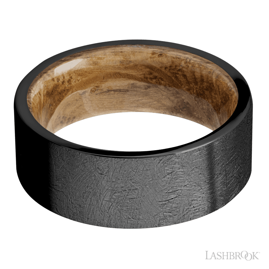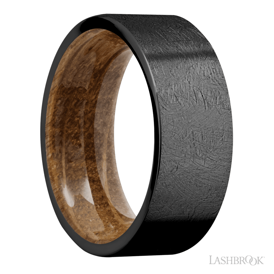 8 mm wide Flat Zirconium band featuring a Whiskey Barrel sleeve.