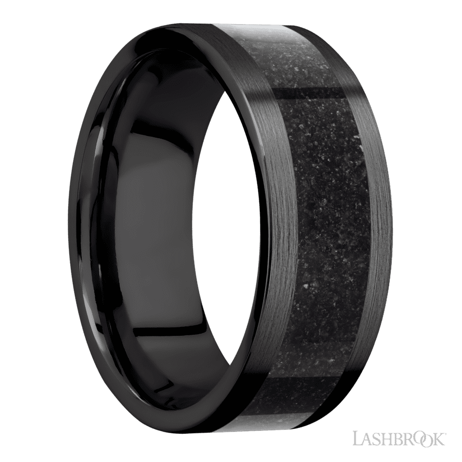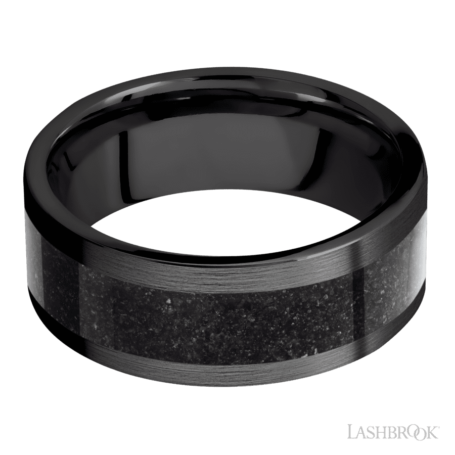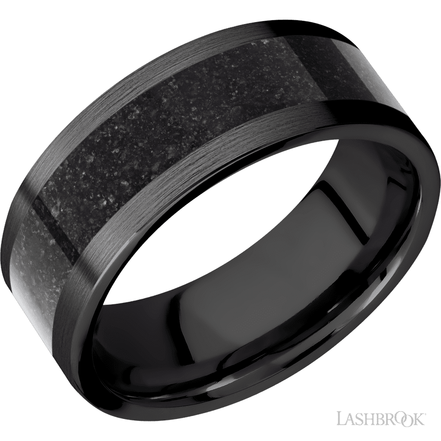 8 mm wide/Flat/Zirconium band with one 5 mm Centered inlay of Dinosaur Bone Black.