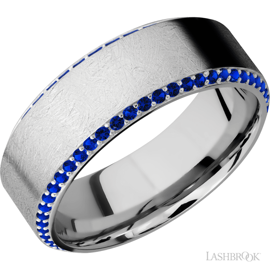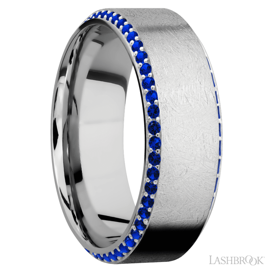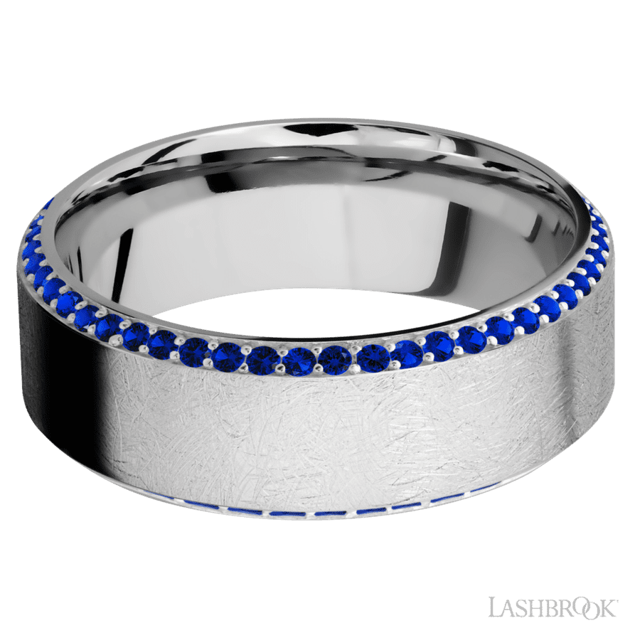 8 mm wide/High Bevel/14K White Gold band with a Bevel Eternity arrangement of .01 carat Round Sapphire stones in a Bead setting.