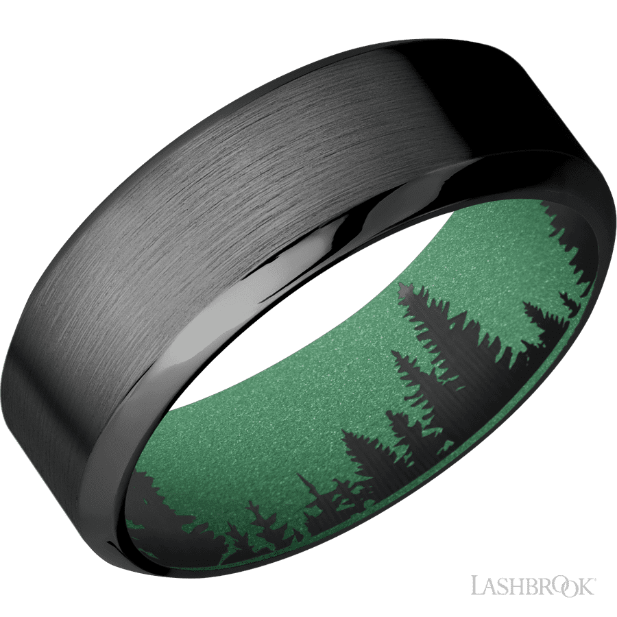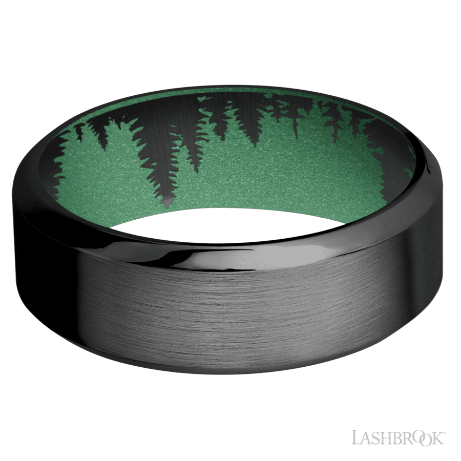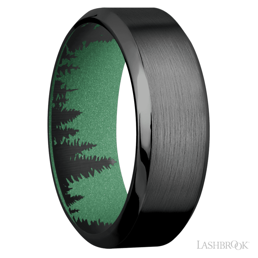8 mm wide High Bevel Zirconium band featuring a Squatch sleeve.