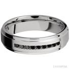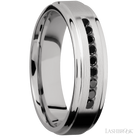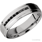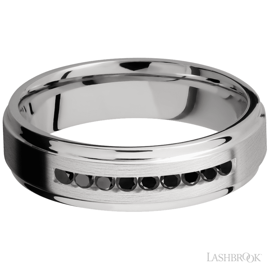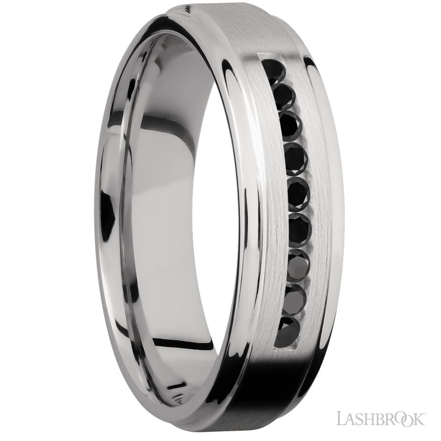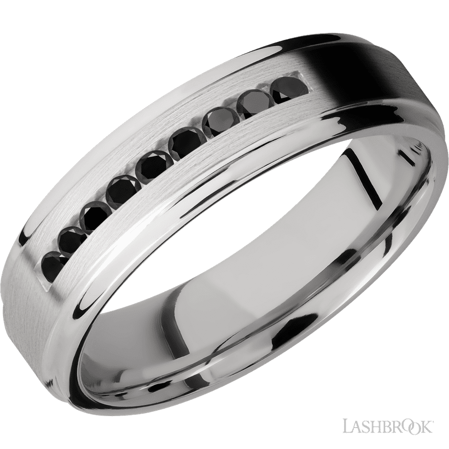 6 mm wide/Flat Grooved Edges/Cobalt Chrome band with an arrangement of 9, .03 carat Round Black Diamond stones in a Channel setting.