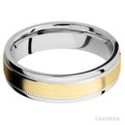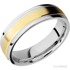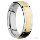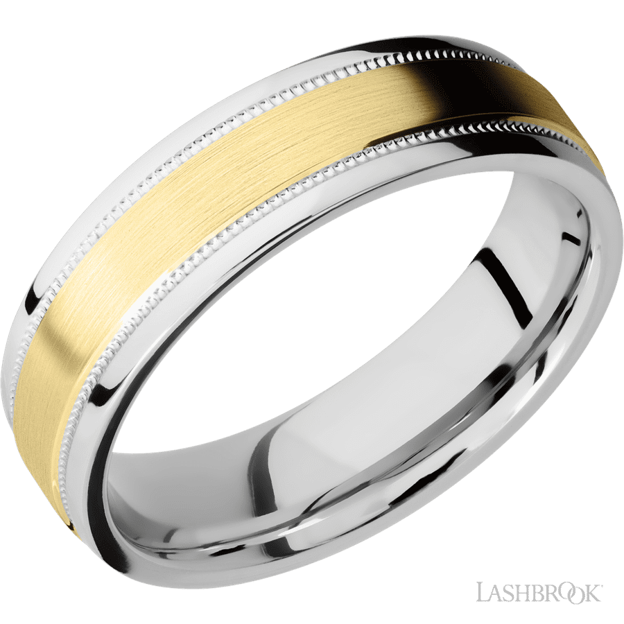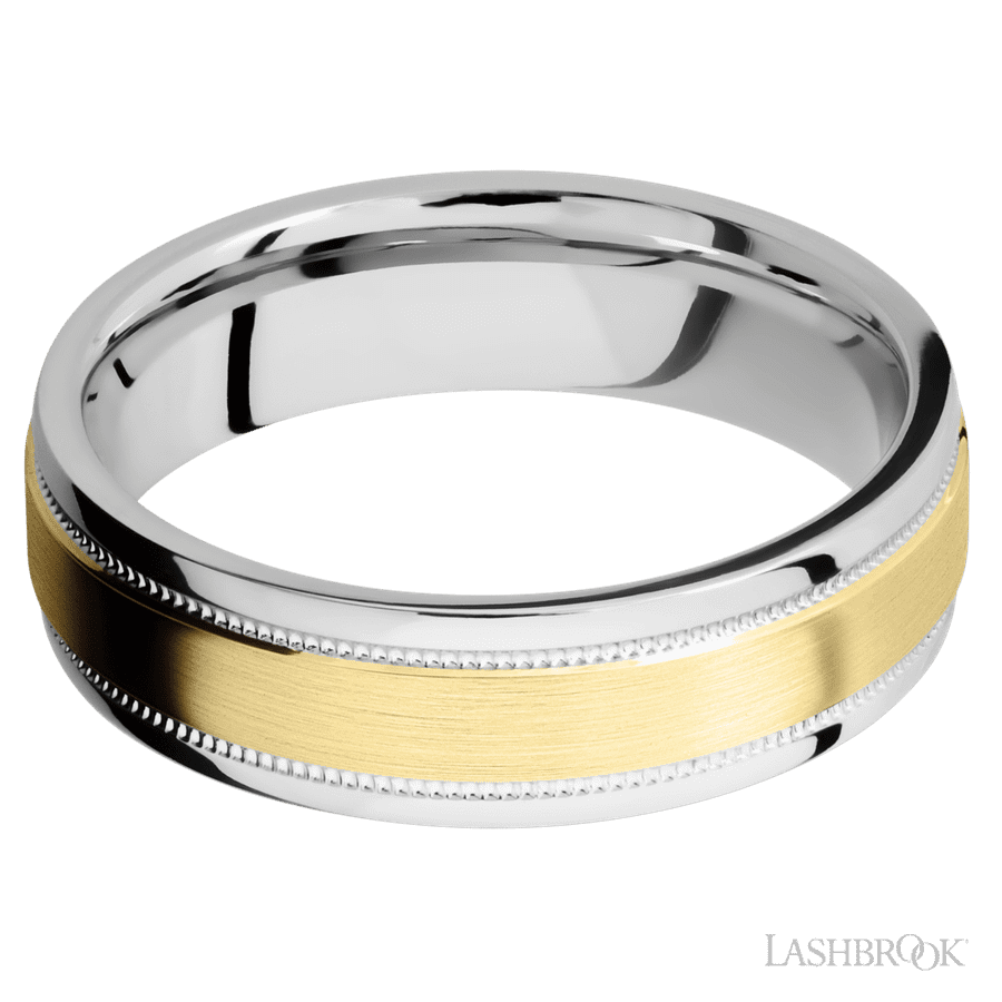 6 mm wide/Flat Stepped Edges Milgrain/Cobalt Chrome band with one 3 mm Raised Centered inlay of 14K Yellow Gold.