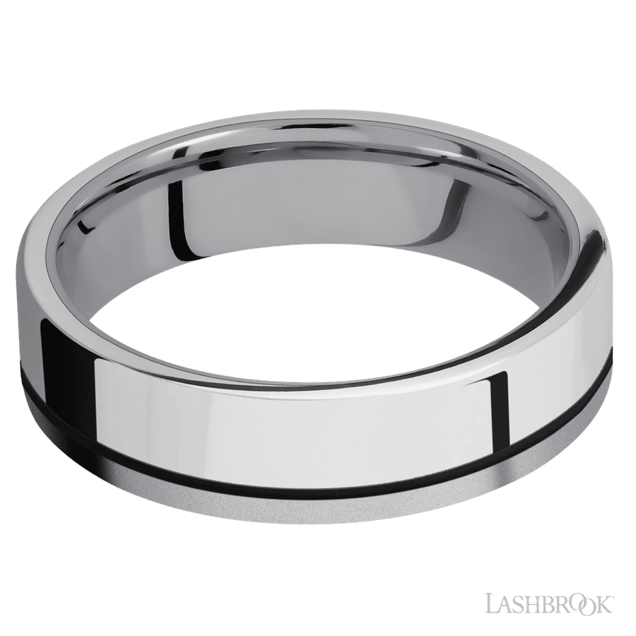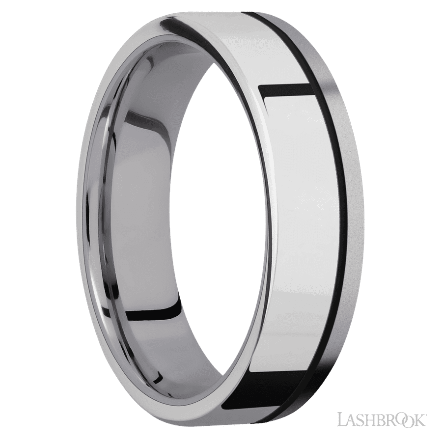 6 mm wide/Flat/Tantalum band with one 4 mm Off Center Edge inlay of Palladium Silver.