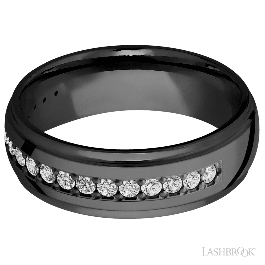 7 mm wide/Domed Stepped Down Edges/Zirconium band with a Half Eternity arrangement of .03 carat Round Diamond stones in a Bead setting.