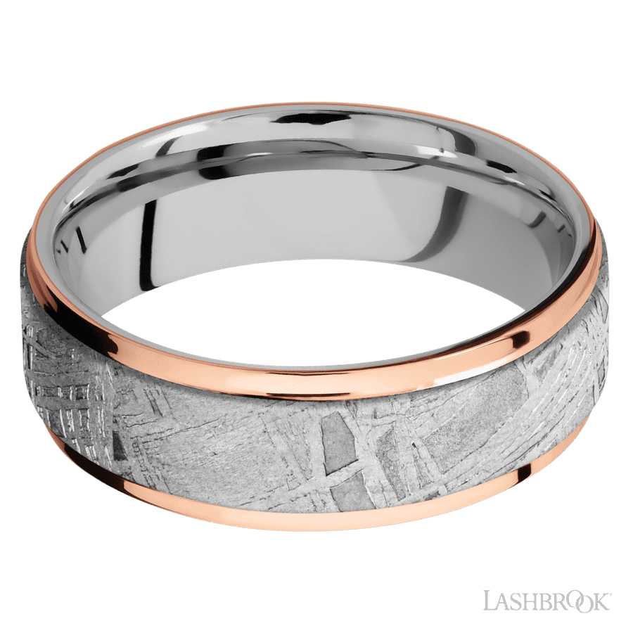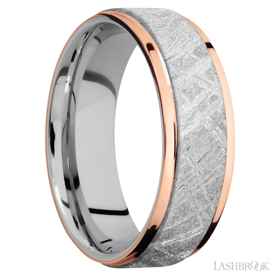 7 mm wide/Flat Grooved Edges/Cobalt Chrome band featuring inlays of Meteorite and 14K Rose Gold.
