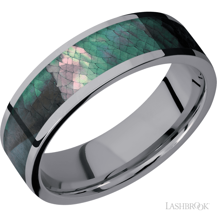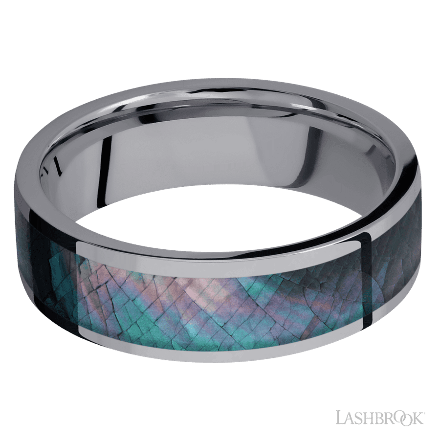 7 mm wide/Flat/Tantalum band with one 5 mm Centered inlay of Black Mother of Pearl.