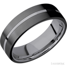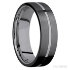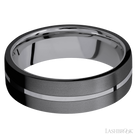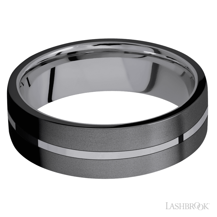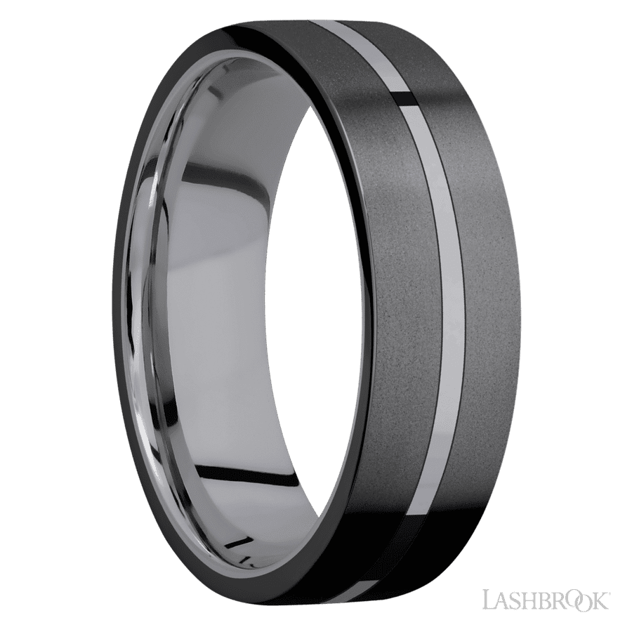 7 mm wide/Flat/Tantalum band with two 3 mm Double Off Center Edge inlays of Zirconium.