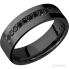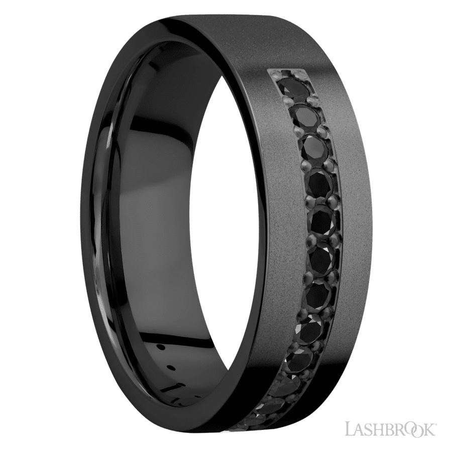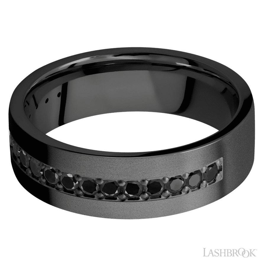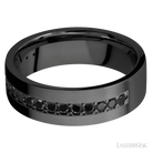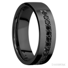 7 mm wide/Flat/Zirconium band with a Half Eternity arrangement of .03 carat Round Black Diamond stones in a Bead setting.