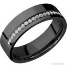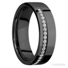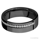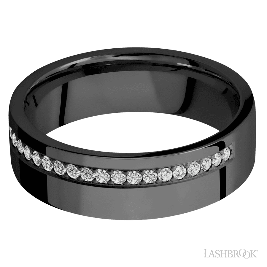 7 mm wide/Flat/Zirconium band with a Off Center Half Eternity arrangement of .015 carat Round Diamond stones in a Bead setting.
