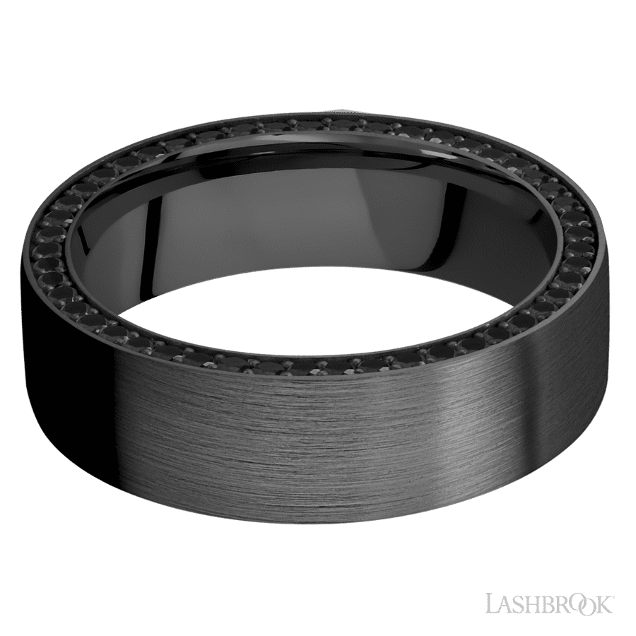 7 mm wide/Flat/Zirconium band with a Side Eternity arrangement of .01 carat Round Black Diamond stones in a Bead setting.