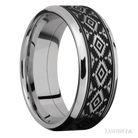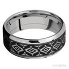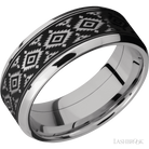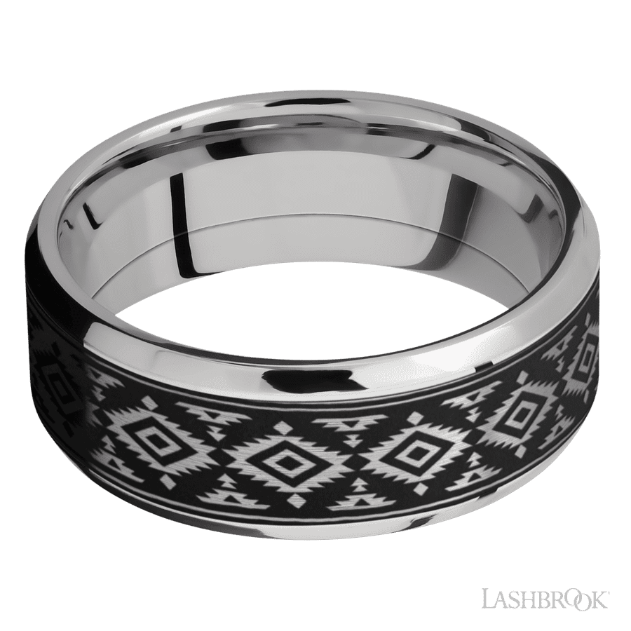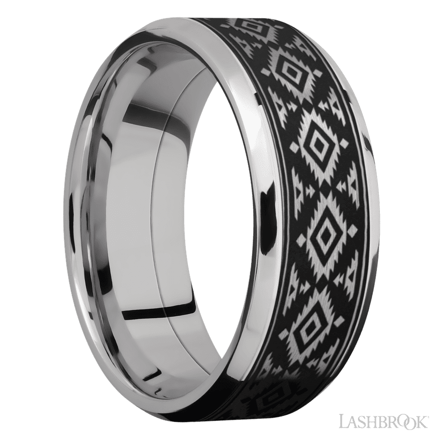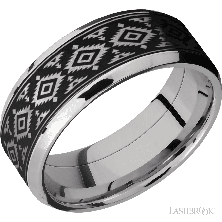 8 mm wide/Beveled/Cobalt Chrome band with one 6 mm Centered inlay of Tantalum with a laser carved Aztec 2 pattern.