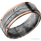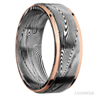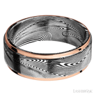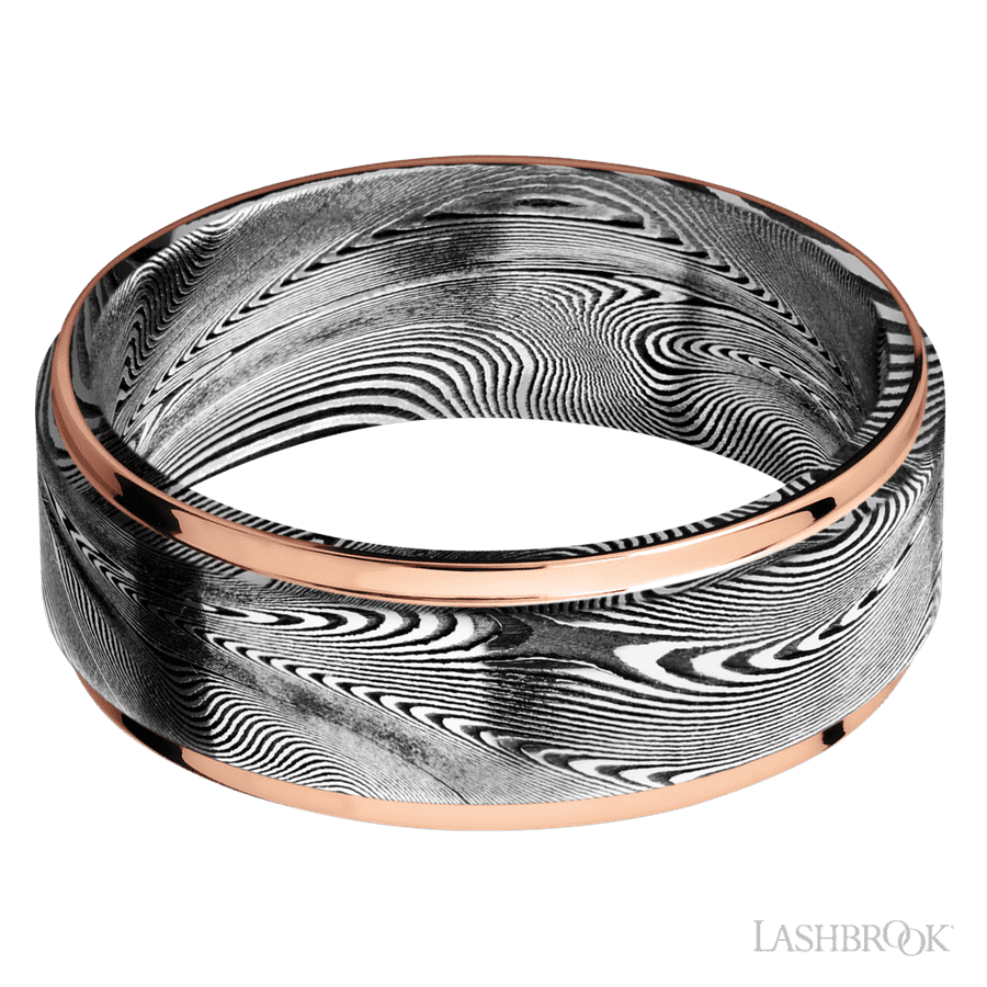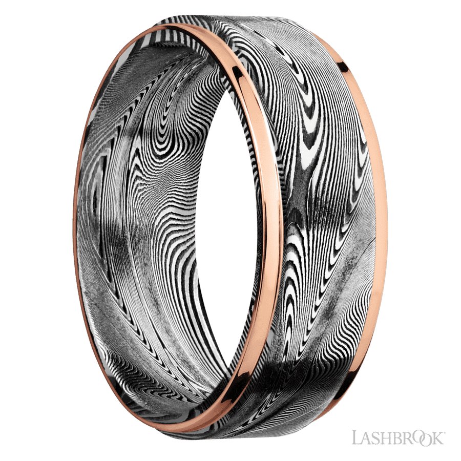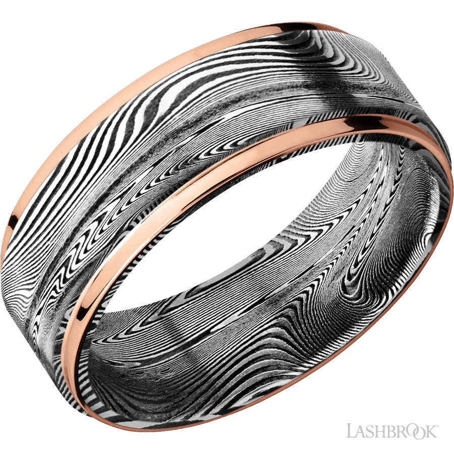 8 mm wide/Flat Grooved Edges/Tightweave band with two 1 mm Edge inlays of 14K Rose Gold.