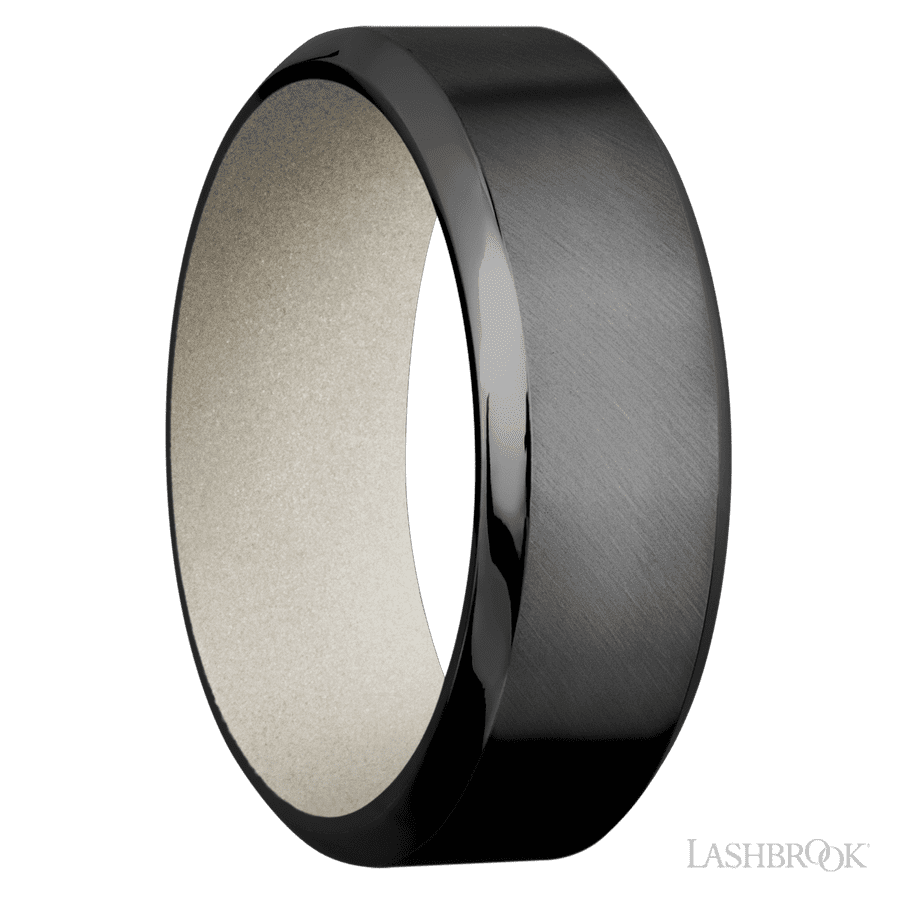 8 mm wide High Bevel Zirconium band featuring a Bright Nickel sleeve.