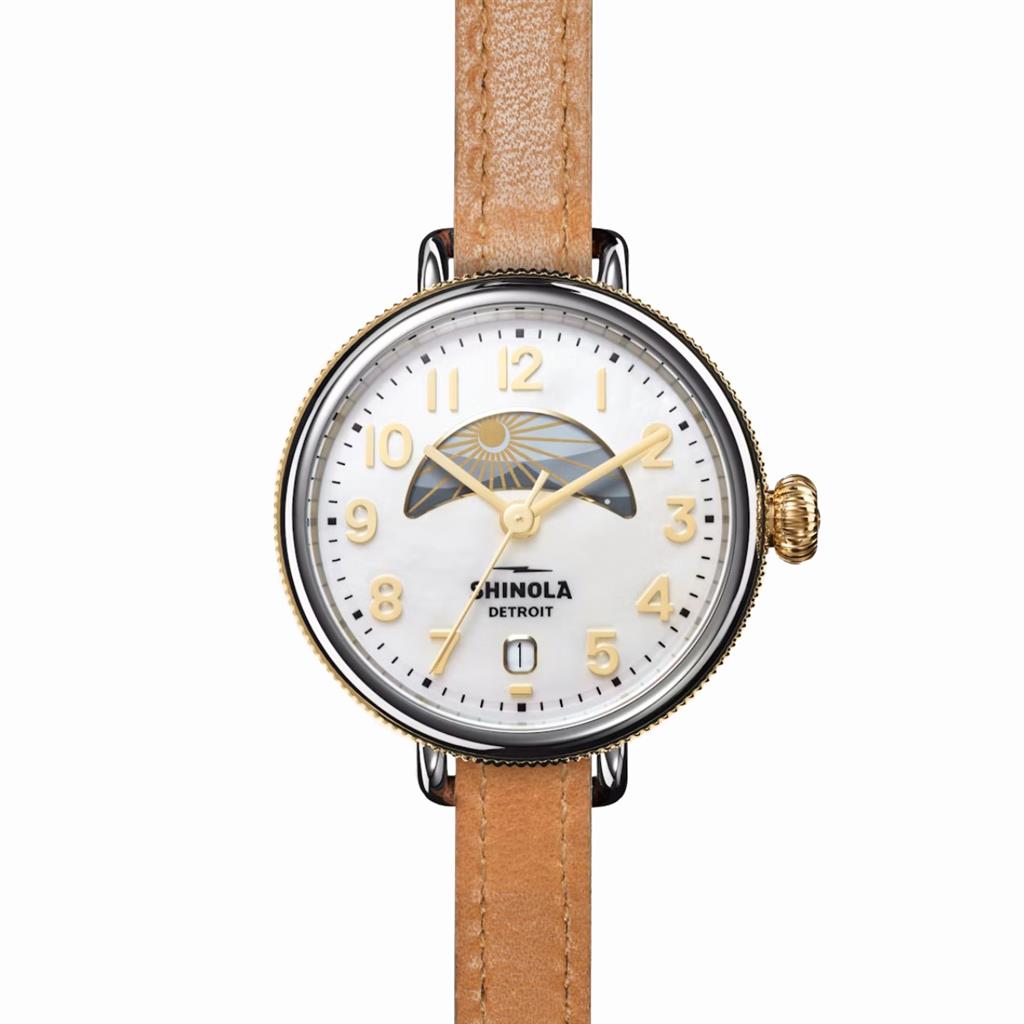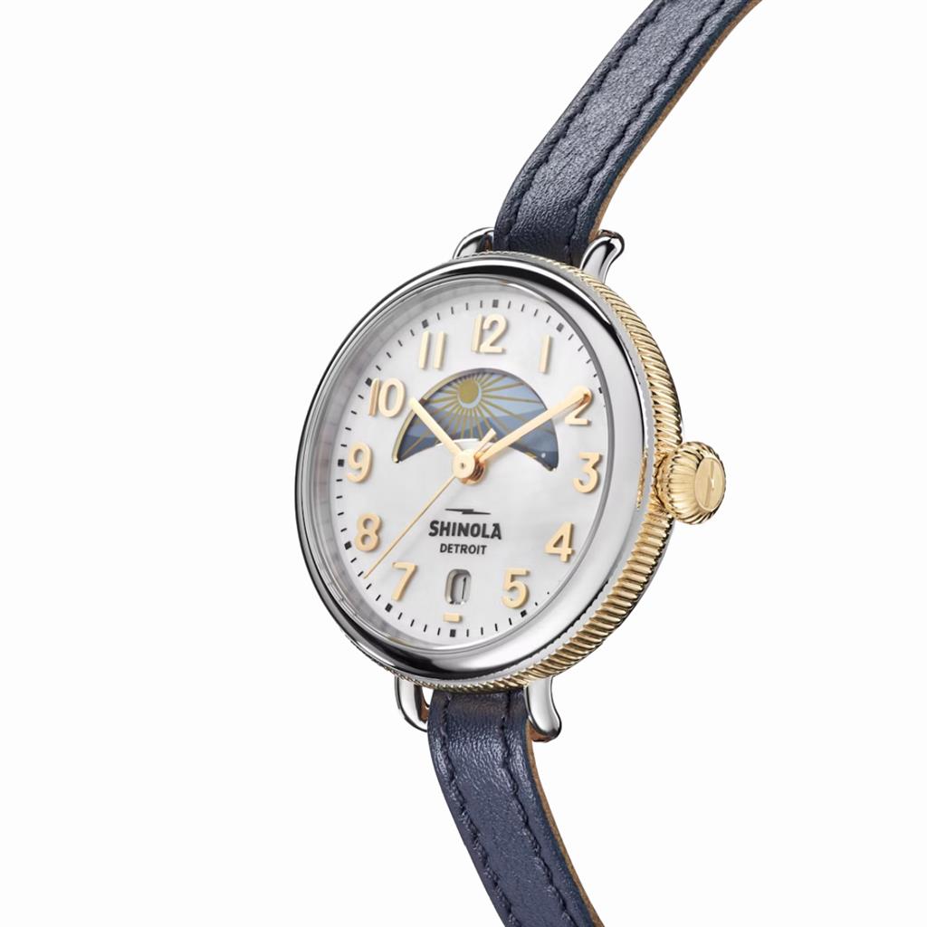 Two Tone Polished Stainless Steel and PVD Gold; Dial- Mother-of-Pearl Moon Phase; Strap - 10mm Navy/Bourbon Leather